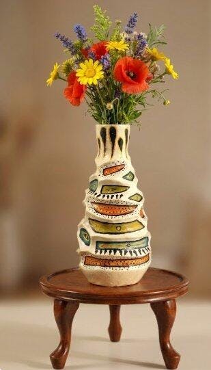 Expertly hand-painted, this Boho-inspired ceramic vase infuses your décor with a lively and colorful accent. Its unique design and vibrant hues make it a standout piece that enhances any space with artistic charm. Ideal for both modern and eclectic interiors, this vase adds depth and personality while reflecting a love for handcrafted quality and style.
