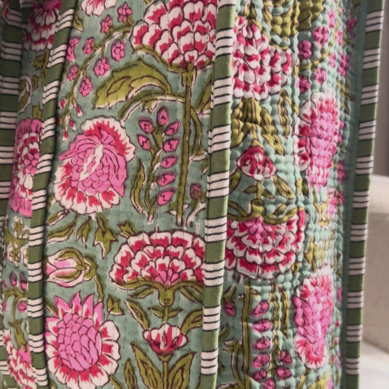 The Quilted Tote Bag in green combines refined craftsmanship with functional design. Featuring an intricately hand-printed block pattern, this tote highlights artisan attention to detail. Its quilted texture adds durability and structure, ensuring it maintains its shape through everyday use. Sized thoughtfully to accommodate essentials for both shopping excursions and travel, it provides ample space without compromising on portability. This tote balances aesthetic appeal with practical utility, making it an indispensable accessory for those who appreciate quality and versatility in their day-to-day carry.